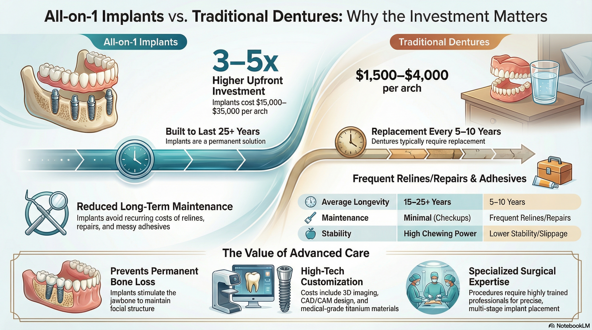 Choosing between All-on-1 dental implants and traditional dentures is about weighing upfront cost against a long-term investment in your oral health and daily well-being. Implants cost more initially, but many patients find that over time, the advantages in stability, function, bone health, and self-esteem far outweigh the upfront cost. Let’s break down what this means for your long-term wallet and quality of life.